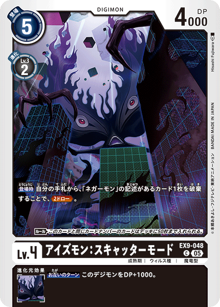 Lv.4 アイズモン:スキャッターモード EX9-048 C 成熟期 | ウィルス種 | 魔竜型 【登場時】自分の手札から、「ネガーモン」の記述があるカード1枚を破棄することで、≪2ドロー≫。 〈ルール〉このカードと同じカードナンバーのカードはデッキに50枚まで入れられる。 --- 【お互いのターン】このデジモンをDP+1000。