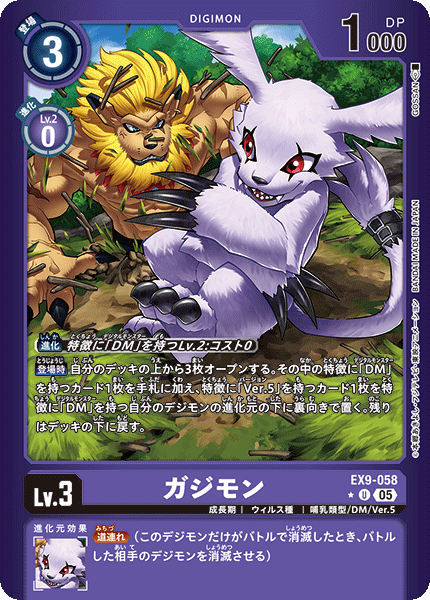Lv.3 ガジモン EX9-058 U 成長期 | ウィルス種 | 哺乳類型/DM/Ver.5 【登場時】自分のデッキの上から3枚オープンする。その中の特徴に「DM」を持つカード1枚を手札に加え、特徴に「Ver.5」を持つカード1枚を特徴に「DM」を持つ自分のデジモンの進化元の下に裏向きで置く。残りはデッキの下に戻す。 --- ≪道連れ≫(このデジモンだけがバトルで消滅したとき、バトルした相手のデジモンを消滅させる)