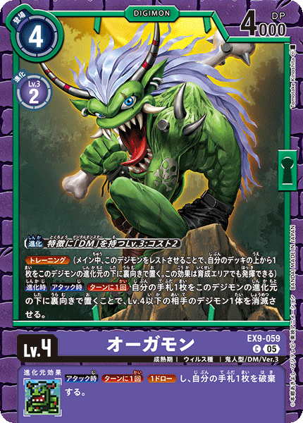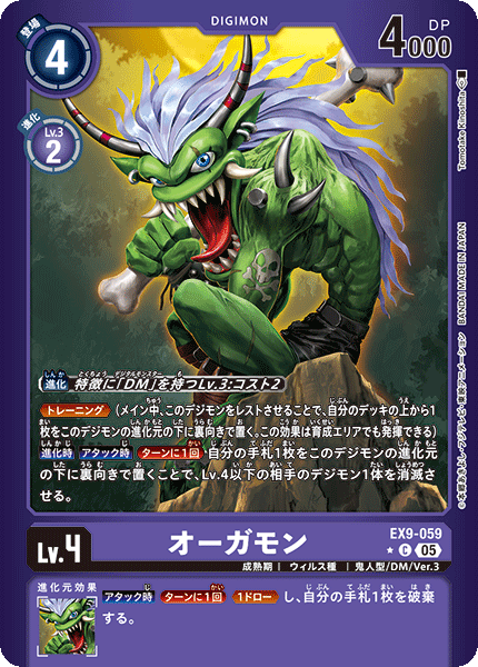 Lv.4 オーガモン EX9-059 C 成熟期 | ウィルス種 | 鬼人型/DM/Ver.3 ≪トレーニング≫(メイン中、このデジモンをレストさせることで、自分のデッキの上から1枚をこのデジモンの進化元の下に裏向きで置く。この効果は育成エリアでも発揮できる) 【進化時】【アタック時】[ターンに1回]自分の手札1枚をこのデジモンの進化元の下に裏向きで置くことで、Lv.4以下の相手のデジモン1体を消滅させる。 --- 【アタック時】[ターンに1回]≪1ドロー≫し、自分の手札1枚を破棄する。