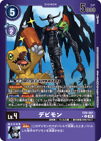 Lv.4 デビモン EX9-061 U 成熟期 | ウィルス種 | 堕天使型/DM/Ver.1 ≪トレーニング≫(メイン中、このデジモンをレストさせることで、自分のデッキの上から1枚をこのデジモンの進化元の下に裏向きで置く。この効果は育成エリアでも発揮できる) 【アタック時】[ターンに1回]自分のデッキの上から1枚をこのデジモンの進化元の下に裏向きで置くことで、Lv.3以下の相手のデジモン1体を消滅させる。このデジモンの裏向きの進化元2枚ごとに、この効果のLv.上限+1。 --- ≪道連れ≫(このデジモンだけがバトルで消滅したとき、バトルした相手のデジモンを消滅させる)