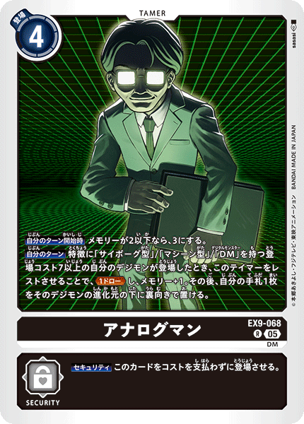 アナログマン EX9-068 R DM 【自分のターン開始時】メモリーが2以下なら、3にする。 【自分のターン】特徴に「サイボーグ型」/「マシーン型」/「DM」を持つ登場コスト7以上の自分のデジモンが登場したとき、このテイマーをレストさせることで、≪1ドロー≫し、メモリー+1。その後、自分の手札1枚をそのデジモンの進化元の下に裏向きで置ける。 --- 【セキュリティ】このカードをコストを支払わずに登場させる。