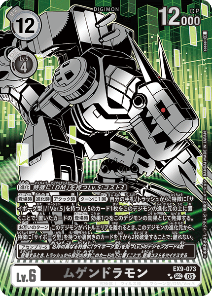 Lv.6 ムゲンドラモン EX9-073 SEC 究極体 | ウィルス種 | マシーン型/DM/Ver.5 【登場時】【進化時】【アタック時】[ターンに1回]自分の手札/トラッシュから、特徴に「サイボーグ型」/「Ver.5」を持つLv.5のカード1枚をこのデジモンの進化元の上に置くことで、置いたカードの【登場時】効果1つをこのデジモンの効果として発揮する。 【お互いのターン】このデジモンがバトルエリアを離れるとき、このデジモンの進化元から、特徴に「サイボーグ型」を持つか裏向きのカードを下から2枚破棄することで、離れない。 ---