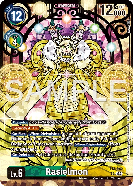 Lv.6 Rasielmon LM-042 P Mega | Vaccine | Throne [Digivolve] Lv.5 w/[Angel]/[Archangel] trait: Cost 3 <Security A. +1> [On Play] [When Digivolving] Suspend 1 of your opponent's Digimon or Tamers. Then, until their turn ends, 1 of their Digimon or Tamers can't activate [When Digivolving] effects or unsuspend. [On Deletion] Place this card as the bottom security card. (Rule) Trait: Has [Three Great Angels]. --- -