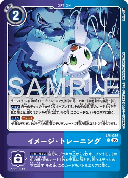 Image Training LM-056 P While you have don't have [Image Training] in the battle area, you can ignore this card's color requirements. [Main] Reveal the top 2 cards of your deck. Add 1 blue or purple card among them to the hand. Return the rest to the bottom of deck. Then, place this card in the battle area. [Main] <Delay> • 1 of your Digimon may digivolve into a blue or purple Digimon card in your hand for its digivolution cost. When it would digivolve by this effect, reduce the cost by 2. --- [Security] Reveal the top 2 cards of your deck. Add 1 blue or purple card among them to the hand. Return the rest to the bottom of deck. Then, place this card in the battle area.