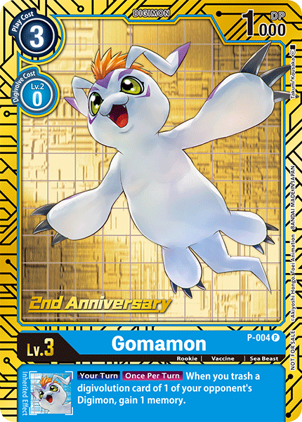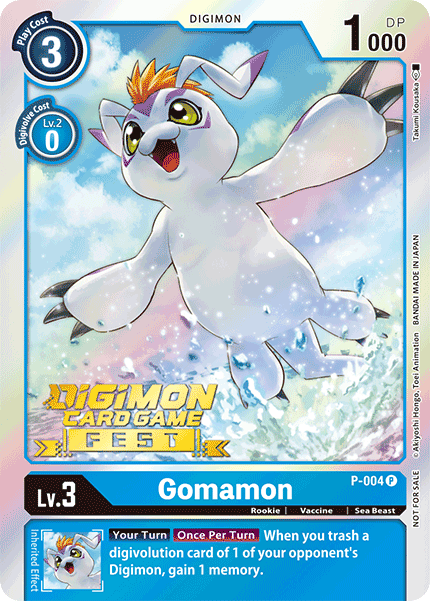 Lv.3 Gomamon P-004 P Rookie | Vaccine | Sea Beast - --- [Your Turn] [Once Per Turn] When you trash a digivolution card of 1 of your opponent's Digimon, gain 1 memory.