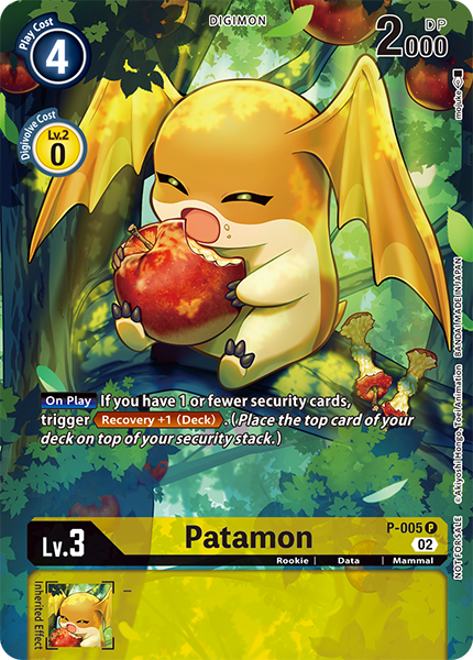 Lv.3 Patamon P-005 P rookie | Data | Mammal [On Play] If you have 1 or fewer security cards, <Recovery +1 (Deck)>.