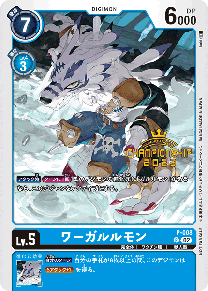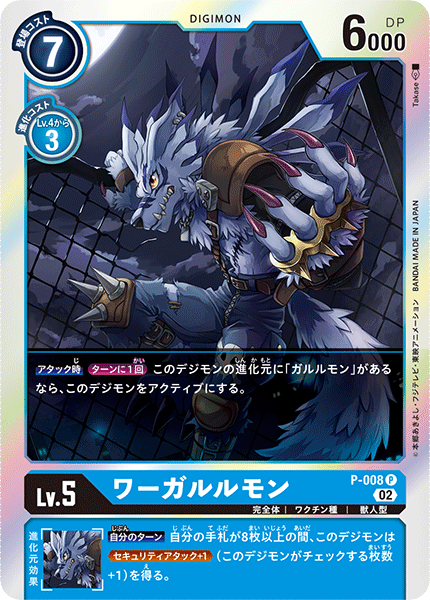 Lv.5 ワーガルルモン P-008 P 完全体 | ワクチン種 | 獣人型 【アタック時】[ターンに1回]このデジモンの進化元に「ガルルモン」があるなら、このデジモンをアクティブにする。 --- 【自分のターン】自分の手札が8枚以上の間、このデジモンは≪Sアタック+1≫を得る。