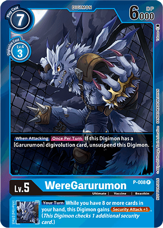 Lv.5 WereGarurumon P-008 P Ultimate | Vaccine | Beastkin [When Attacking] [Once Per Turn] If this Digimon has a [Garurumon] digivolution card, unsuspend this card. --- [Your Turn] While you have 8 or more cards in your hand, this Digimon gains <Security Attack +1>. (This Digimon checks 1 additional security card.)