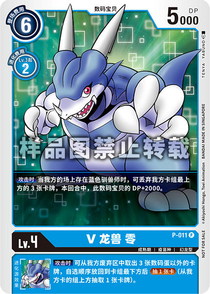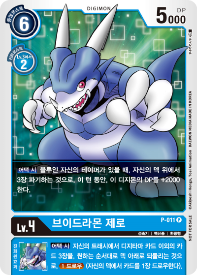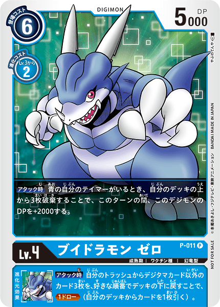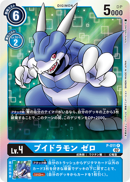 Lv.4 ブイドラモン ゼロ P-011 P 成熟期 | ワクチン種 | 幻竜型 【アタック時】青の自分のテイマーがいるなら、自分のデッキの上から3枚破棄することで、このターンの間、このデジモンをDP+2000。 --- 【アタック時】自分のトラッシュからデジタマカード以外のカード3枚を好きな順番でデッキの下に戻すことで、≪1ドロー≫(自分のデッキからカードを1枚引く)。