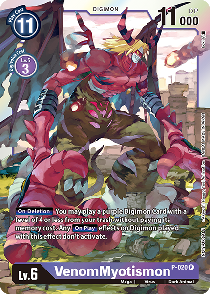 Lv.6 VenomMyotismon P-020 P Mega | Virus | Dark Animal [On Deletion] You may play a purple Digimon Card with a level of 4 or less from your trash without paying its memory cost. Any [On Play] effects on Digimon played with this effect don't activate.