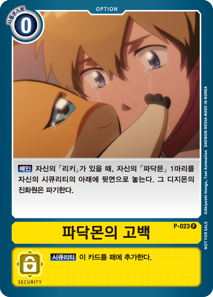 パタモンの告白 P-023 P 【メイン】自分の「高石 タケル」がいるとき、自分の「パタモン」1体を自分のセキュリティの下に裏向きで置く。そのデジモンの進化元は破棄する。 --- 【セキュリティ】このカードを手札に加える。