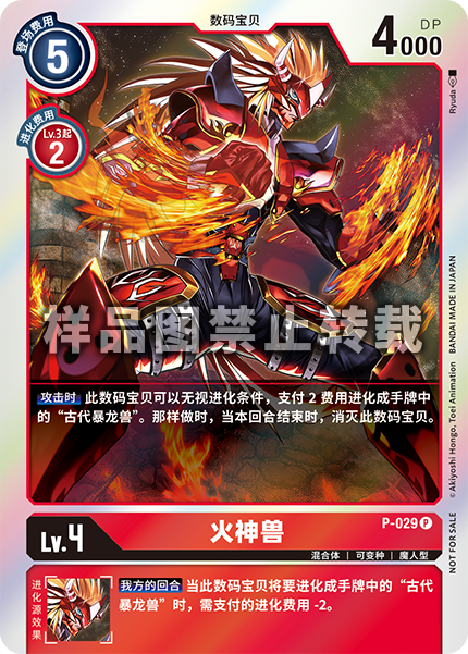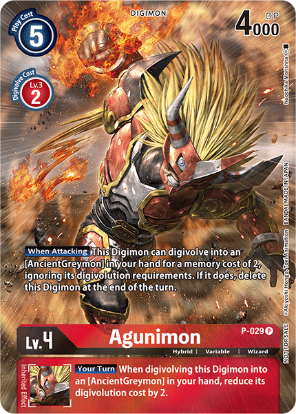 Lv.4 Agunimon P-029 P Hybrid | Variable | Wizard [When Attacking] This Digimon can digivolve into an [AncientGreymon] in your hand for a memory cost of 2, ignoring its digivolution requirements. If it does, delete this Digimon at the end of the turn. --- [Your Turn] When digivolving this Digimon into an [AncientGreymon] in your hand, reduce its digivolution cost by 2.