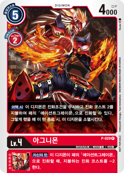 Lv.4 アグニモン P-029 P ハイブリッド体 | ヴァリアブル種 | 魔人型 【アタック時】このデジモンを手札の「エンシェントグレイモン」に進化条件を無視して進化コスト2で進化できる。そうしたとき、このターン終了時、このデジモンは消滅する。 --- 【自分のターン】このデジモンが手札の「エンシェントグレイモン」に進化するとき、支払う進化コスト-2。