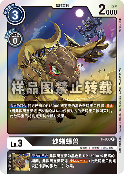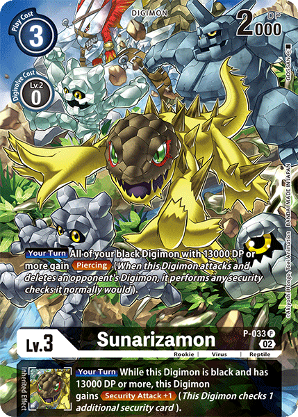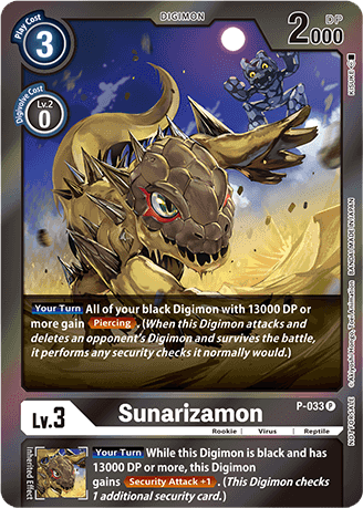 Lv.3 Sunarizamon P-033 P Rookie | Virus | Reptile [Your Turn] All of your black Digimon with 13000 DP or more gain <Piercing>. (When this Digimon attacks and deletes an opponent's Digimon and survives the battle, it performs any security checks it normally would.) --- [Your Turn] While this Digimon is black and has 13000 DP or more, this Digimon gains <Security Attack +1>. (This Digimon checks 1 additional security card.)