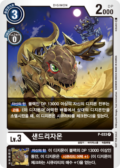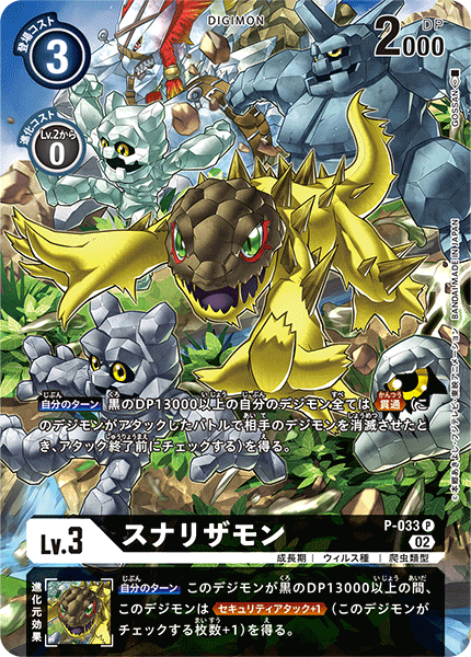 Lv.3 スナリザモン P-033 P 成長期 | ウィルス種 | 爬虫類型 【自分のターン】黒のDP13000以上の自分のデジモン全ては≪貫通≫(このデジモンがアタックしたバトルで相手のデジモンを消滅させたとき、アタック終了前にチェックする)を得る。 --- 【自分のターン】このデジモンが黒のDP13000以上の間、このデジモンは≪セキュリティアタック+1≫(このデジモンがチェックする枚数+1)を得る。