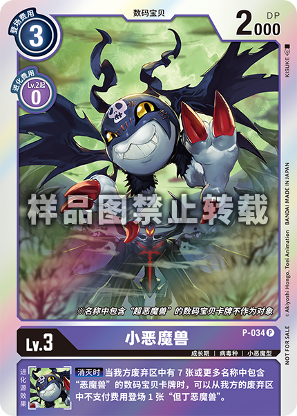 Lv.3 DemiDevimon P-034 P Rookie | Virus | Evil - --- [On Deletion] If you have 7 or more Digimon cards with [Devimon] in their names in your trash, you may play 1 [DanDevimon] from your trash without paying its memory cost.