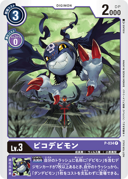 Lv.3 ピコデビモン P-034 P 成長期 | ウィルス種 | 小悪魔型 --- 【消滅時】自分のトラッシュに名称に「デビモン」を含むデジモンカードが7枚以上あるとき、自分のトラッシュから、「ダンデビモン」1枚をコストを支払わずに登場できる。