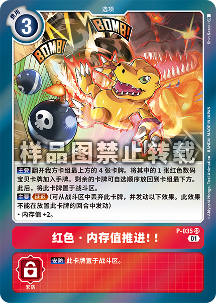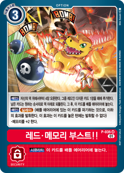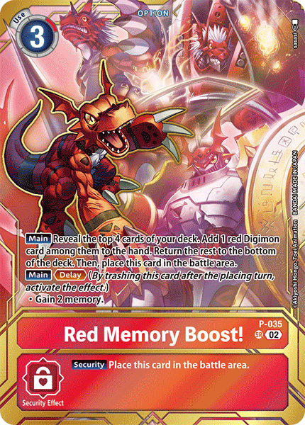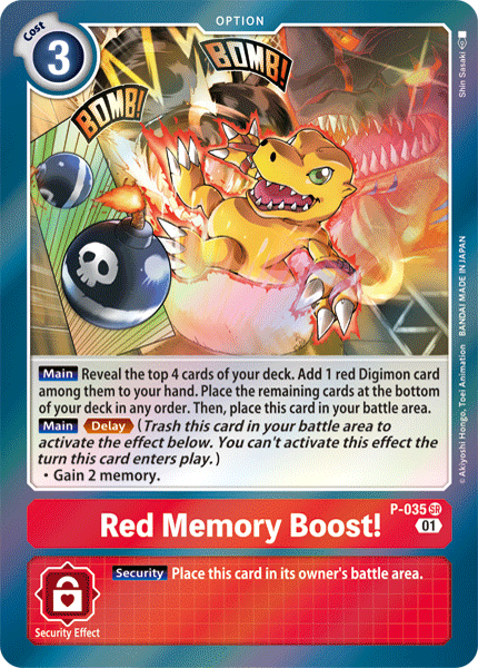 Red Memory Boost! P-035 SR [Main] Reveal the top 4 cards of your deck. Add 1 red Digimon card among them to the hand. Place the remaining cards at the bottom of your deck in any order. Then, place this card in your battle area. [Main] <Delay> • Gain 2 memory. --- [Security] Place this card in the battle area.