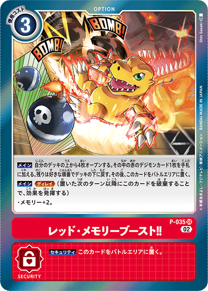 レッド• メモリーブースト!! P-035 SR 【メイン】自分のデッキの上から4枚オープンする。その中の赤のデジモンカード1枚を手札に加える。残りは好きな順番でデッキの下に戻す。その後、このカードをバトルエリアに置く。 【メイン】≪ディレイ≫(置いた次のターン以降にこのカードを破棄することで、効果を発揮する) • メモリー+2。 --- 【セキュリティ】このカードをバトルエリアに置く。
