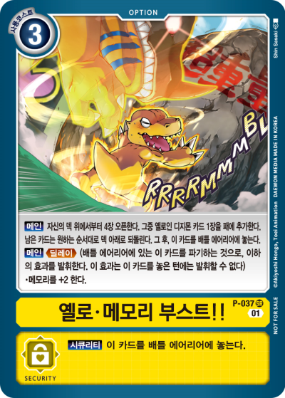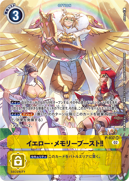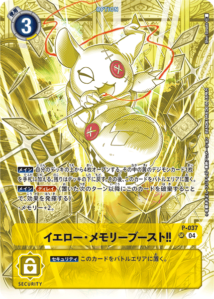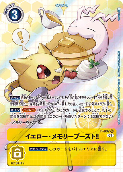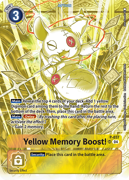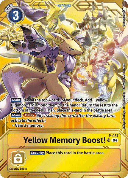 Yellow Memory Boost! P-037 SR [Main] Reveal the top 4 cards of your deck. Add 1 yellow Digimon card among them to the hand. Place the remaining cards at the bottom of your deck in any order. Then, place this card in your battle area. [Main] <Delay> • Gain 2 memory. --- [Security] Place this card in the battle area.