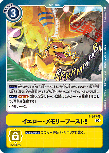 イエロー• メモリーブースト!! P-037 SR 【メイン】自分のデッキの上から4枚オープンする。その中の黄のデジモンカード1枚を手札に加える。残りは好きな順番でデッキの下に戻す。その後、このカードをバトルエリアに置く。 【メイン】≪ディレイ≫(置いた次のターン以降にこのカードを破棄することで、効果を発揮する) • メモリー+2。 --- 【セキュリティ】このカードをバトルエリアに置く。
