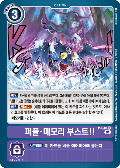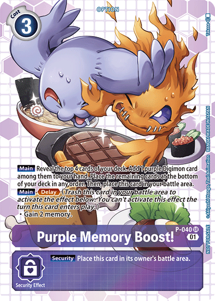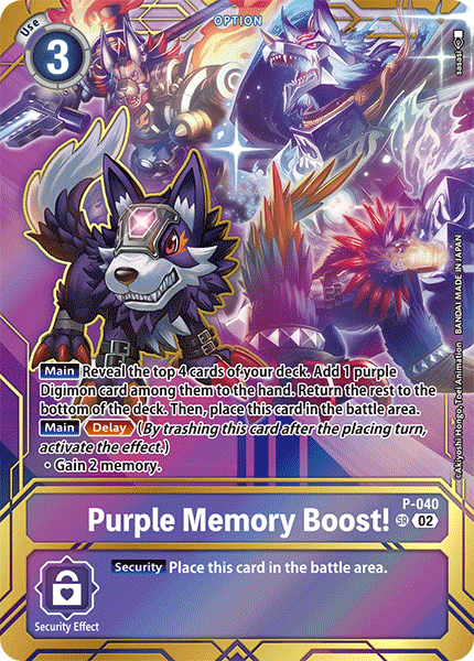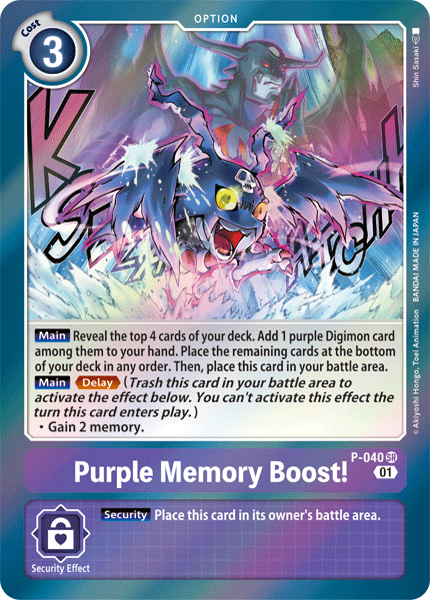 Purple Memory Boost! P-040 SR [Main] Reveal the top 4 cards of your deck. Add 1 purple Digimon card among them to the hand. Place the remaining cards at the bottom of your deck in any order. Then, place this card in your battle area. [Main] <Delay> • Gain 2 memory. --- [Security] Place this card in the battle area.