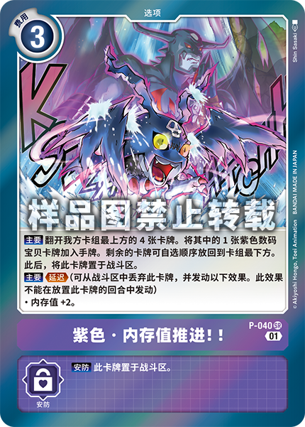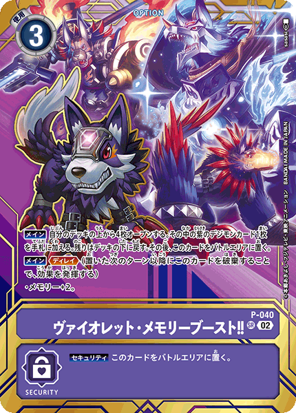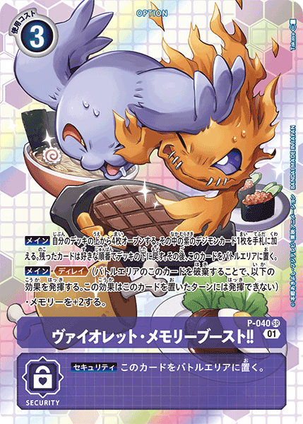 ヴァイオレット• メモリーブースト!! P-040 SR 【メイン】自分のデッキの上から4枚オープンする。その中の紫のデジモンカード1枚を手札に加える。残りは好きな順番でデッキの下に戻す。その後、このカードをバトルエリアに置く。 【メイン】≪ディレイ≫(置いた次のターン以降にこのカードを破棄することで、効果を発揮する) • メモリー+2。 --- 【セキュリティ】このカードをバトルエリアに置く。