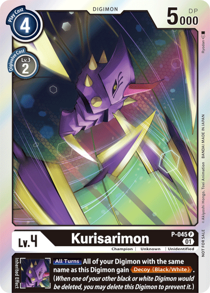 Lv.4 Kurisarimon P-045 P champion | Unknown | Unidentified --- [All Turns] All of your other Digimon with the same name as this Digimon gain <Decoy (Black/White)>.