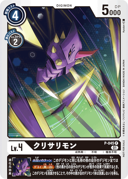 Lv.4 クリサリモン P-045 P 成熟期 | 不明 | 種族不明 --- 【お互いのターン】このデジモンと同じ名称の他の自分のデジモン全ては≪デコイ《黒》《白》≫(他の黒か白の自分のデジモンが相手の効果で消滅するとき、このデジモンを消滅させることで、その中の黒か白のデジモン1体は消滅しない)を得る。