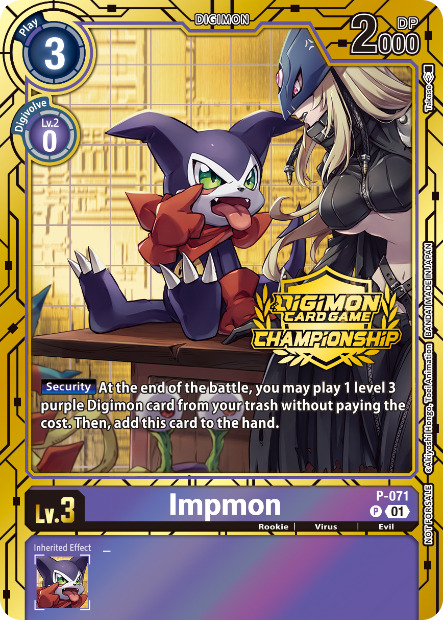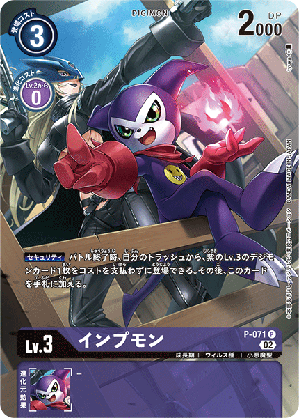 Lv.3 Impmon P-071 P Rookie | Virus | Evil --- [Security] At the end of the battle, you may play 1 purple level 3 Digimon card from your trash without paying its memory cost. Then, add this card to its owner's hand.