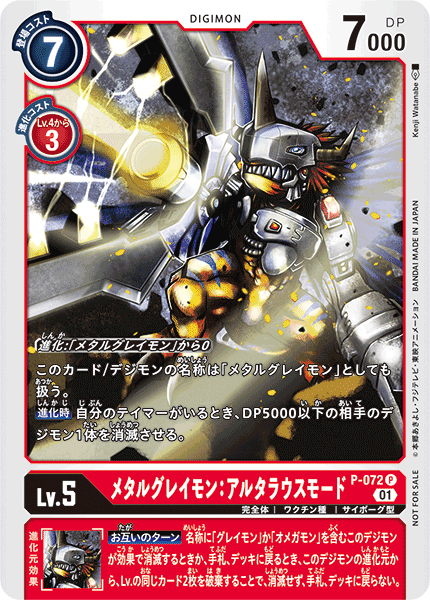 Lv.5 メタルグレイモン:アルタラウスモード P-072 P 完全体 | ワクチン種 | サイボーグ型 このカード/デジモンの名称は「メタルグレイモン」としても扱う。 【進化時】自分のテイマーがいるとき、DP5000以下の相手のデジモン1体を消滅させる。 --- 【お互いのターン】名称に「グレイモン」か「オメガモン」を含むこのデジモンが効果で消滅するときか、手札、デッキに戻るとき、このデジモンの進化元から、Lv.の同じカード2枚を破棄することで、消滅せず、手札、デッキに戻らない。