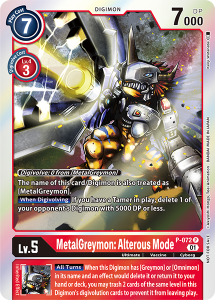 Lv.5 MetalGreymon: Alterous Mode P-072 P Ultimate | Vaccine | Cyborg The name of this card/Digimon is also treated as [MetalGreymon]. [When Digivolving] If you have a Tamer in play, delete 1 of your opponent's Digimon with 5000 DP or less. --- [All Turns] When this Digimon has [Greymon] or [Omnimon] in its name and an effect would delete it or return it to your hand or deck, you may trash 2 cards of the same level in this Digimon's digivolution cards to prevent it from leaving play.