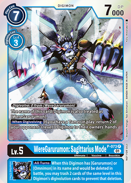 Lv.5 WereGarurumon: Sagittarius Mode P-073 P Ultimate | Beastkin | Vaccine Digivolve: 0 from [WereGarurumon].The name of this card/Digimon is also treated as [WereGarurumon].[When Digivolving] If you have a Tamer in play, return 2 of your opponent's level 3 Digimon to their owners' hands. --- [All Turns] When this Digimon has [Garurumon] or [Omnimon] in its name and would be deleted in battle, you may trash 2 cards of the same level in this Digimon's digivolution cards to prevent that deletion.