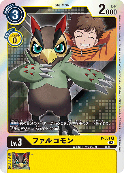 Lv.3 ファルコモン P-081 P 成長期 | ワクチン種 | 鳥型 【登場時】黄の自分のテイマーがいるとき、次の相手のターン終了まで、相手のデジモン1体をDP-2000。 ---