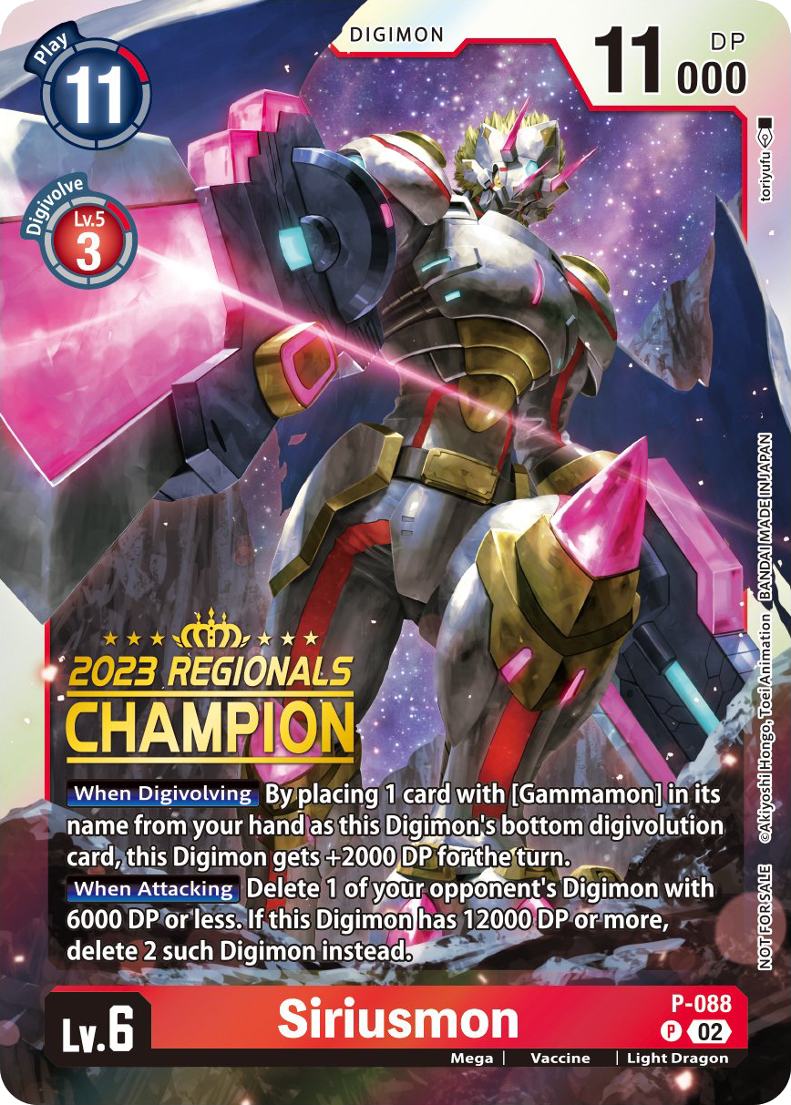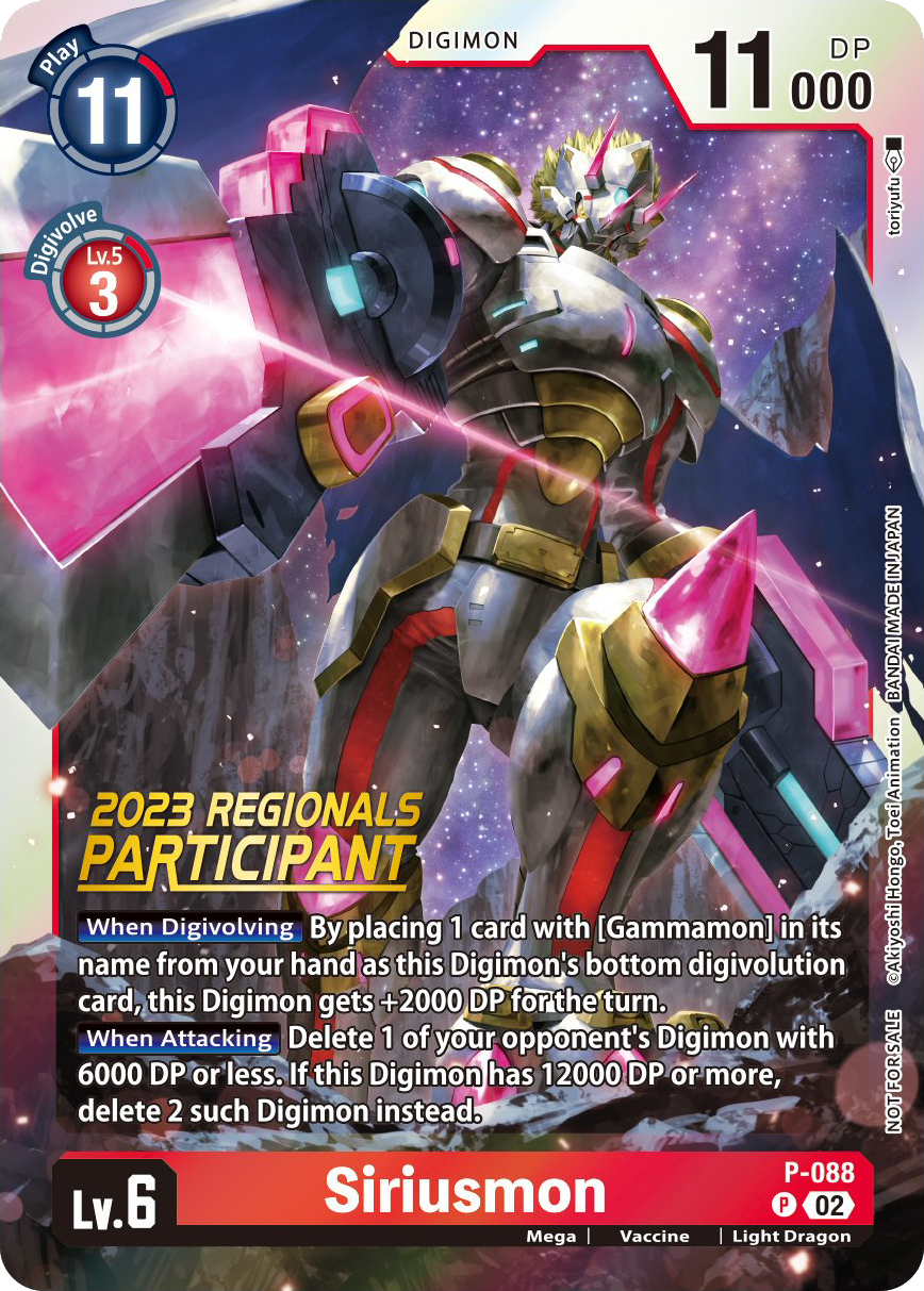 Lv.6 Siriusmon P-088 P Mega | Vaccine | Light Dragon [When Digivolving] By placing 1 card with [Gammamon] in its name from your hand as this Digimon's bottom digivolution card, this Digimon gets +2000 DP for the turn. [When Attacking] Delete 1 of your opponent's Digimon with 6000 DP or less. If this Digimon has 12000 DP or more, Delete 2 such Digimon instead.