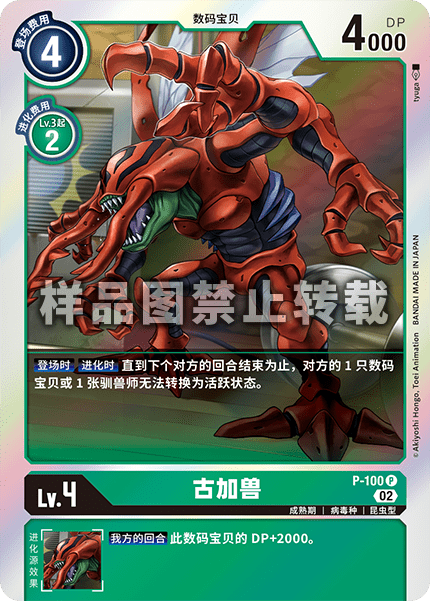 Lv.4 クワガーモン P-100 P 成熟期 | ウィルス種 | 昆虫型 【登場時】【進化時】次の相手のターン終了まで、相手のデジモンかテイマー1体はアクティブにならない。 --- 【自分のターン】このデジモンをDP+2000。