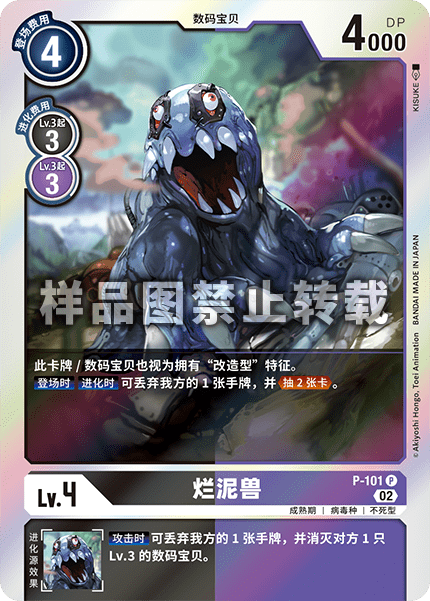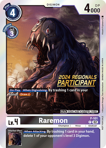 Lv.4 Raremon P-101 P Champion | Virus | Undead [On Play] [When Digivolving] By trashing 1 card from your hand, <Draw 2>. (Rule) Trait: Has [Cyborg] Type. --- [When Attacking] By trashing 1 card from your hand, delete 1 of your opponent's level 3 Digimon.