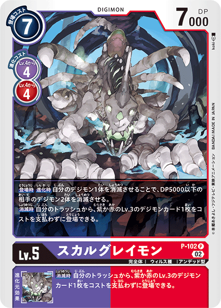 Lv.5 スカルグレイモン P-102 P 完全体 | ウィルス種 | アンデッド型 【登場時】【進化時】自分のデジモン1体を消滅させることで、DP5000以下の相手のデジモン2体を消滅させる。 【消滅時】自分のトラッシュから、紫か赤のLv.3のデジモンカード1枚をコストを支払わずに登場できる。 --- 【消滅時】自分のトラッシュから、紫か赤のLv.3のデジモンカード1枚をコストを支払わずに登場できる。