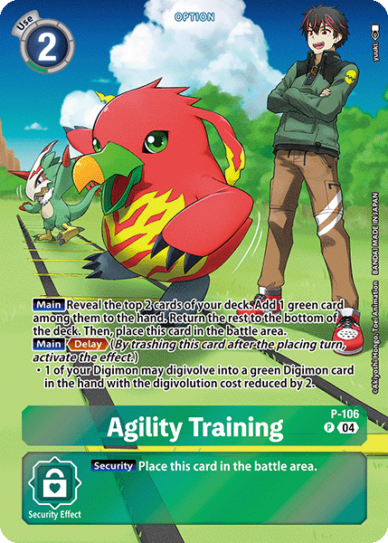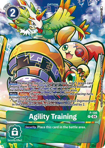 Agility Training P-106 P [Main] Reveal the top 2 cards of your deck. Add 1 green card among them to your hand. Place the rest at the bottom of your deck in any order. Then, place this card in the battle area. [Main] <Delay> • 1 of your Digimon may digivolve into a green Digimon card in your hand for its digivolution cost. When it would digivolve by this effect, reduce the cost by 2. --- [Security] Place this card in the battle area.