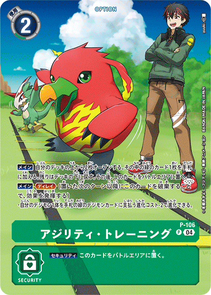 アジリティ• トレーニング P-106 P 【メイン】自分のデッキの上から2枚オープンする。その中の緑のカード1枚を手札に加える。残りは好きな順番でデッキの下に戻す。その後、このカードをバトルエリアに置く。 【メイン】≪ディレイ≫(置いた次のターン以降にこのカードを破棄することで、効果を発揮する) • 自分のデジモン1体を手札の緑のデジモンカードに進化コストを支払って進化できる。この効果で進化するとき、支払う進化コスト-2。 --- 【セキュリティ】このカードをバトルエリアに置く。