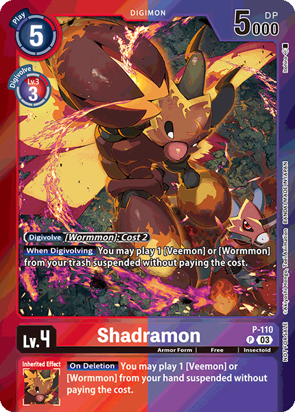 Lv.4 Shadramon P-110 P Armor Form | Free | Insectoid [Digivolve] [Wormmon]: Cost 2 [When Digivolving] You may play 1 [Veemon] or [Wormmon] from your trash suspended without paying the cost. --- [On Deletion] You may play 1 [Veemon] or [Wormmon] from your hand suspended without paying the cost.