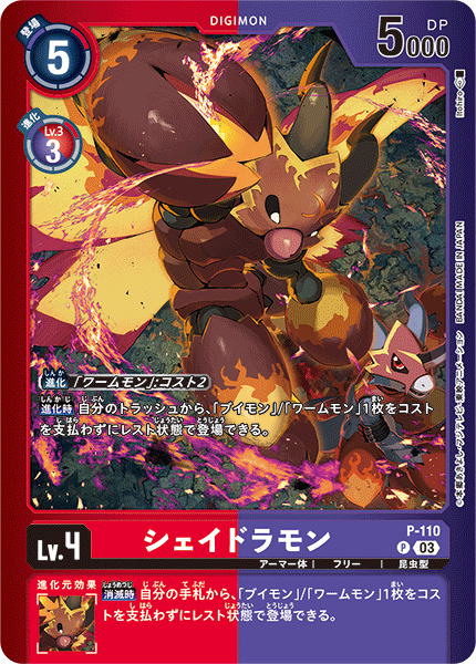 Lv.4 シェイドラモン P-110 P アーマー体 | フリー | 昆虫型 【進化時】自分のトラッシュから、「ブイモン」/「ワームモン」1枚をコストを支払わずにレスト状態で登場できる。 --- 【消滅時】自分の手札から、「ブイモン」/「ワームモン」1枚をコストを支払わずにレスト状態で登場できる。