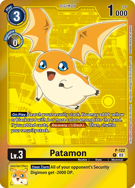 Lv.3 Patamon P-122 P Rookie | Data | Mammal [On Play] Search your security stack. You may add 1 yellow or black card with 2 or more colors among them to the hand. If you added cards, <Recovery +1 (Deck)>. Then, shuffle your security stack. --- [Your Turn] All of your opponent's security Digimon get -2000 DP.
