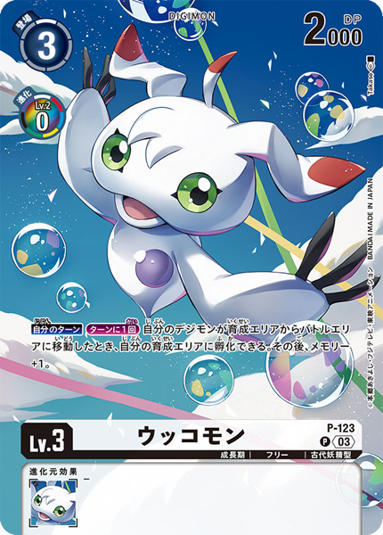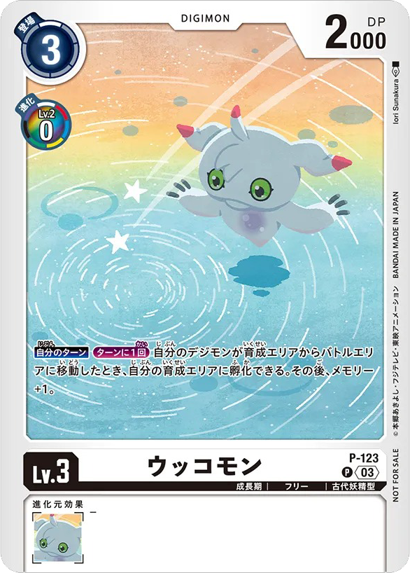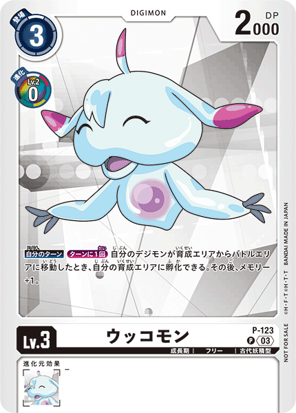Lv.3 ウッコモン P-123 P 成長期 | フリー | 古代妖精型 【自分のターン】[ターンに1回]自分のデジモンが育成エリアからバトルエリアに移動したとき、自分の育成エリアに孵化できる。その後、メモリー+1。 ---