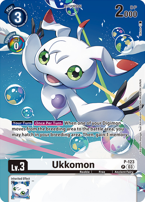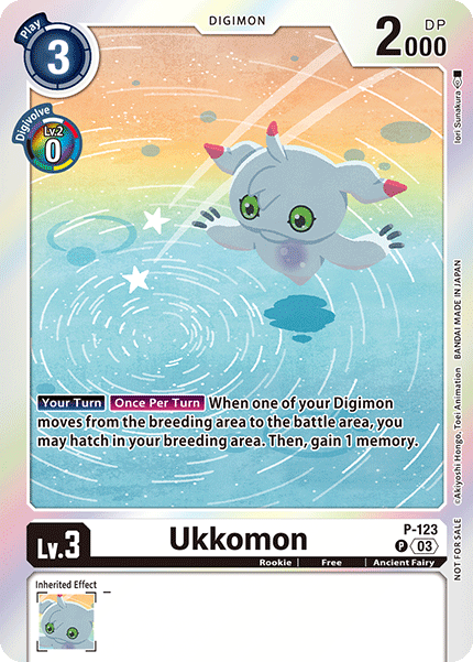Lv.3 Ukkomon P-123 P Rookie | Free | Ancient Fairy [Your Turn] [Once Per Turn] When one of your Digimon moves from the breeding area to the battle area, you may hatch in your breeding area. Then, gain 1 memory. ---