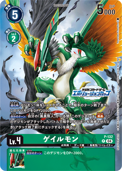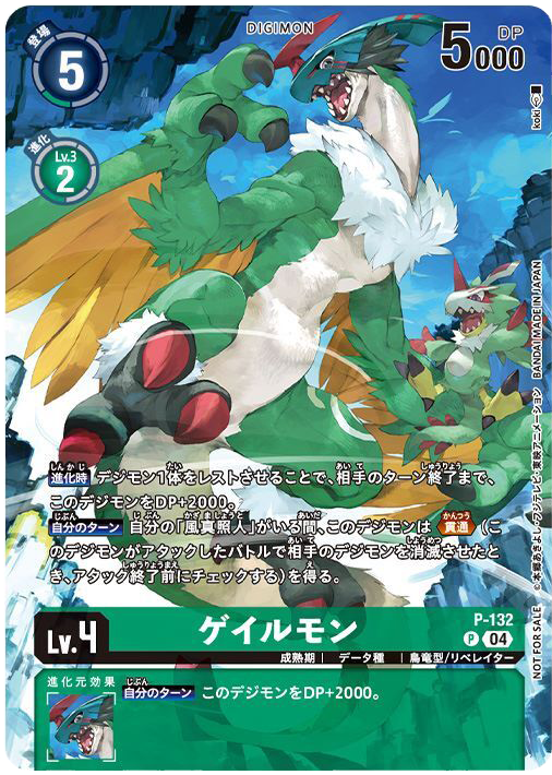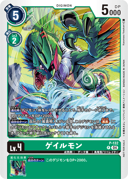 Lv.4 ゲイルモン P-132 P 成熟期 | データ種 | 鳥竜型/リベレイター 【進化時】デジモン1体をレストさせることで、相手のターン終了まで、このデジモンをDP+2000。 【自分のターン】自分の「風真照人」がいる間、このデジモンは≪貫通≫(このデジモンがアタックしたバトルで相手のデジモンを消滅させたとき、アタック終了前にチェックする)を得る。 --- 【自分のターン】このデジモンをDP+2000。