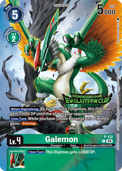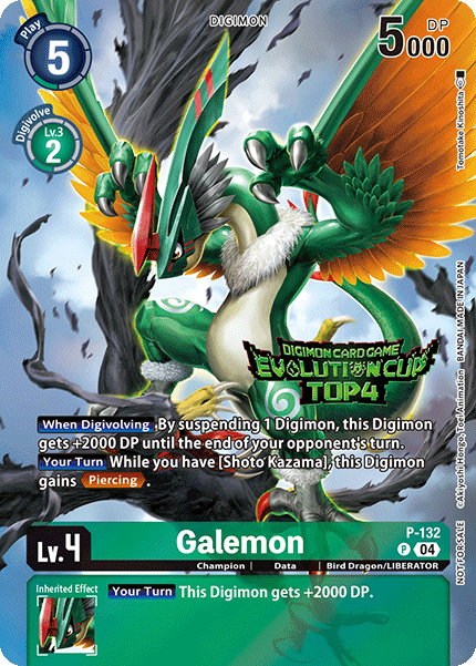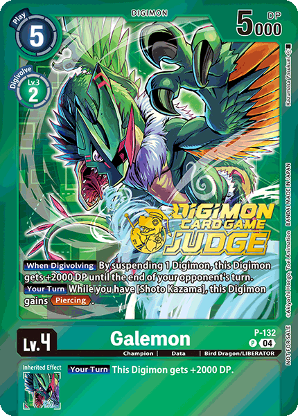 Lv.4 Galemon P-132 P Champion | Data | Bird Dragon/LIBERATOR [When Digivolving] By suspending 1 Digimon, this Digimon gets +2000 DP until the end of your opponent's turn. [Your Turn] While you have [Shoto Kazama], this Digimon gains <Piercing>. --- [Your Turn] This Digimon gets +2000 DP.