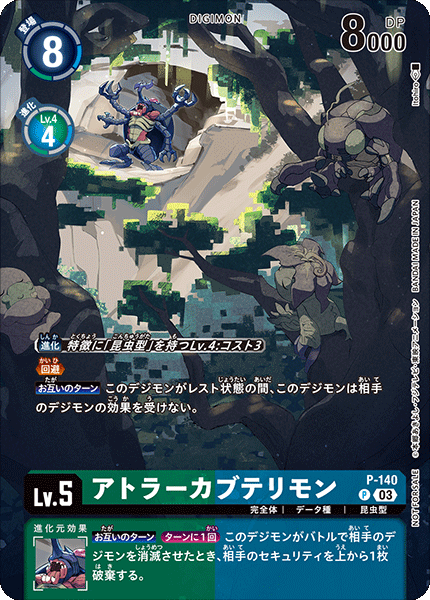 Lv.5 アトラーカブテリモン P-140 P 完全体 | データ種 | 昆虫型 ≪回避≫ 【お互いのターン】このデジモンがレスト状態の間、このデジモンは相手のデジモンの効果を受けない。 --- 【お互いのターン】[ターンに1回]このデジモンがバトルで相手のデジモンを消滅させたとき、相手のセキュリティを上から1枚破棄する。