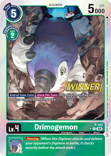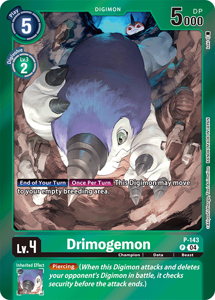 Lv.4 Drimogemon P-143 P Champion | Data | Beast [End of Your Turn] [Once Per Turn] You may move this Digimon to an empty space in your breeding area. --- <Piercing> (When this Digimon attacks and deletes an opponent's Digimon, it performs any security checks it normally would.)