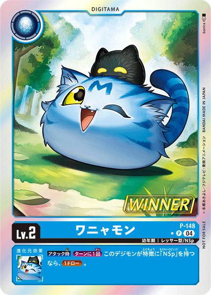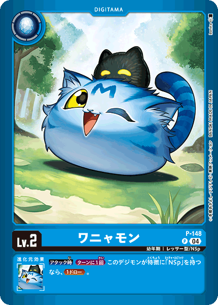 Lv.2 ワニャモン P-148 P 幼年期 | レッサー型/NSp --- 【アタック時】[ターンに1回]このデジモンが特徴に「NSp」を持つなら、≪1ドロー≫。